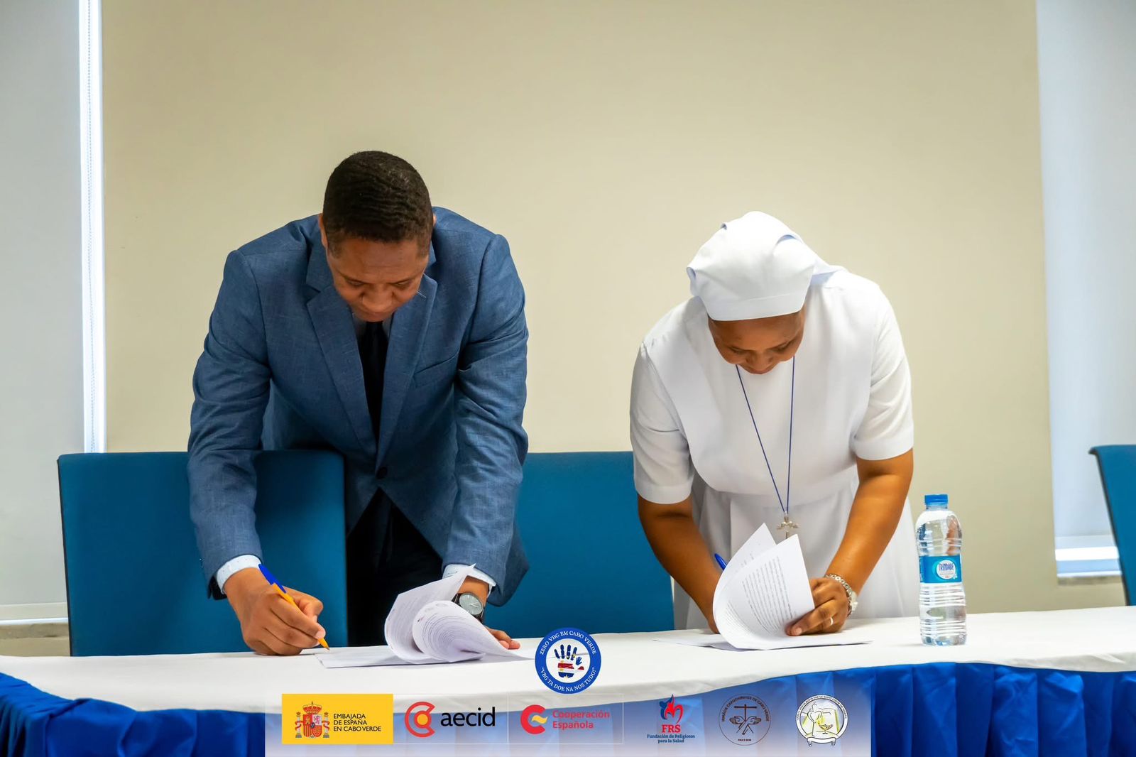 - 1- Fortalecimiento institucional y formación técnica en el tratamiento de casos sobre VG: La formadora Margareth da Luz compartió las líneas de capacitación desarrolladas en la primera fase del proyecto entre 2023 y 2025 y a continuación se firmó un protocolo de colaboración con el Grupo Barceló, representado por su director, Javier Senís Fernández, consolidando una alianza estratégica entre el sector privado y el compromiso social ya que toda la logística de las formaciones son aseguradas por el hotel Barceló Praia.